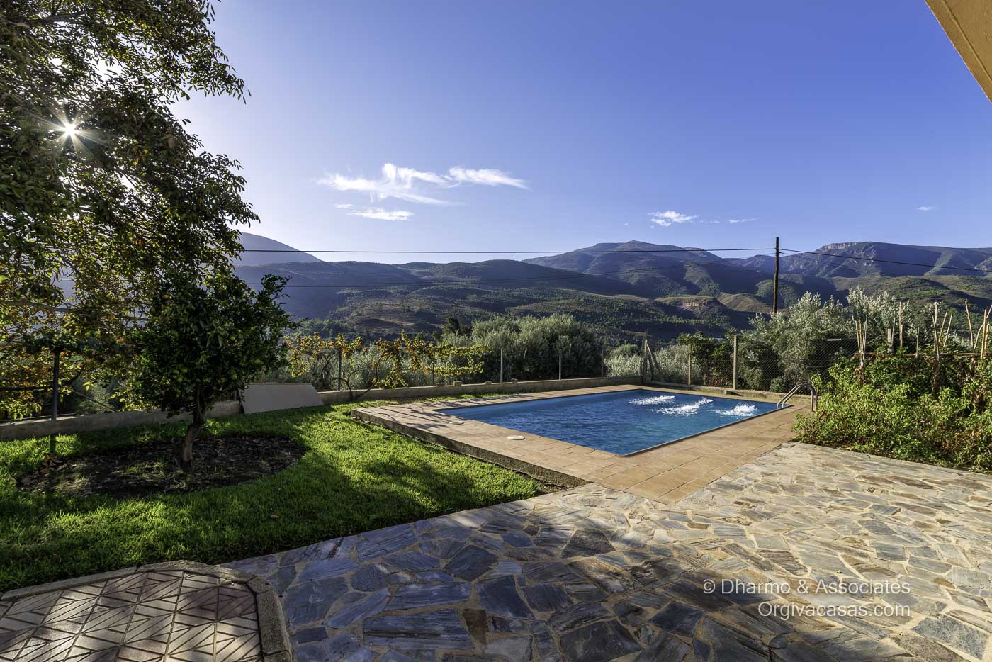 The surrounding land belonging to the house is fenced and divided into two terraces. The upper terrace has the house, pool terrace, swimming pool, fruit trees and space for an orchard and vegetable garden.
